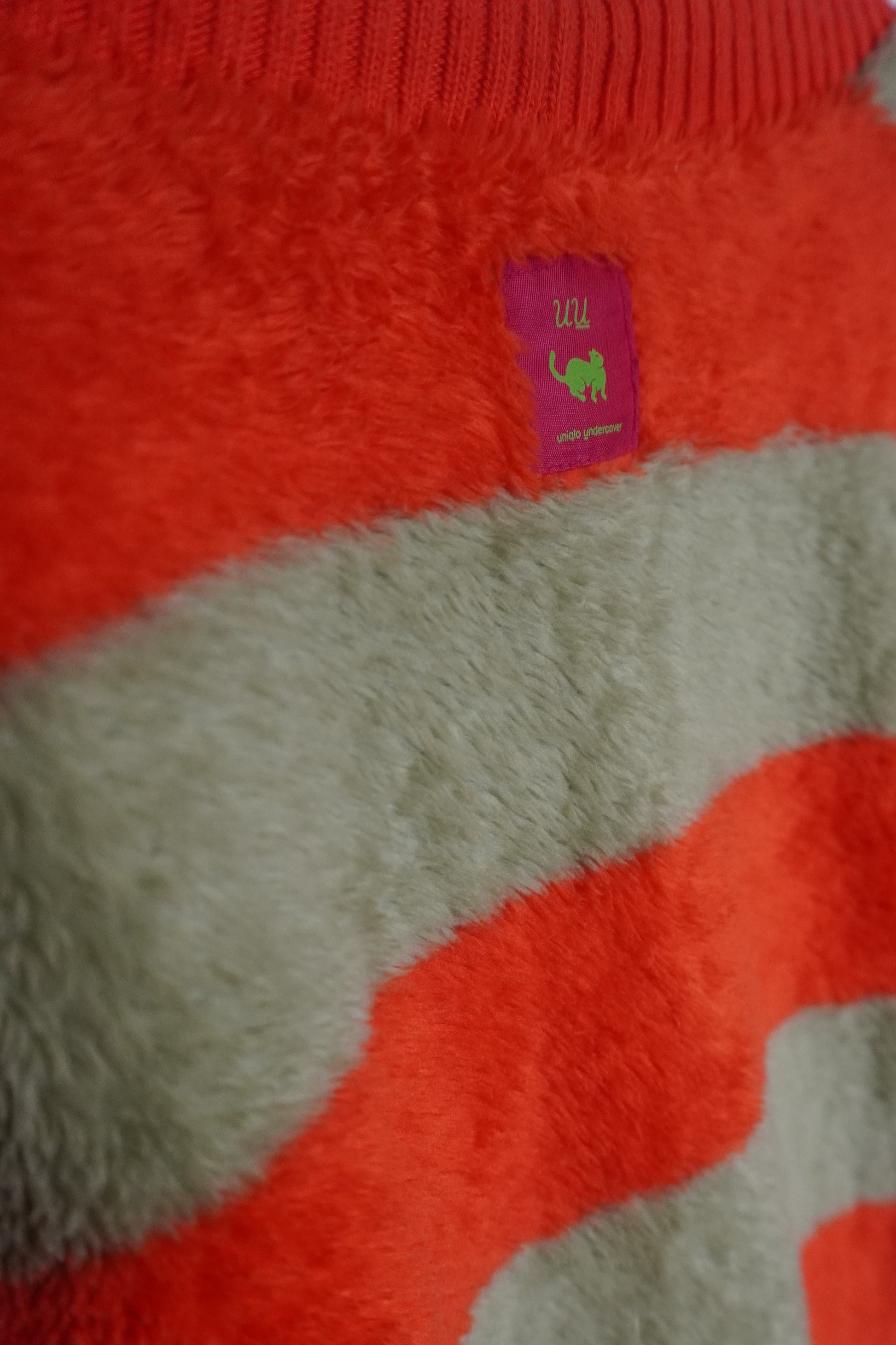 Cardigan bicolore orange et vert clair en maille effet fausse fourrure, au style original et chaleureux.