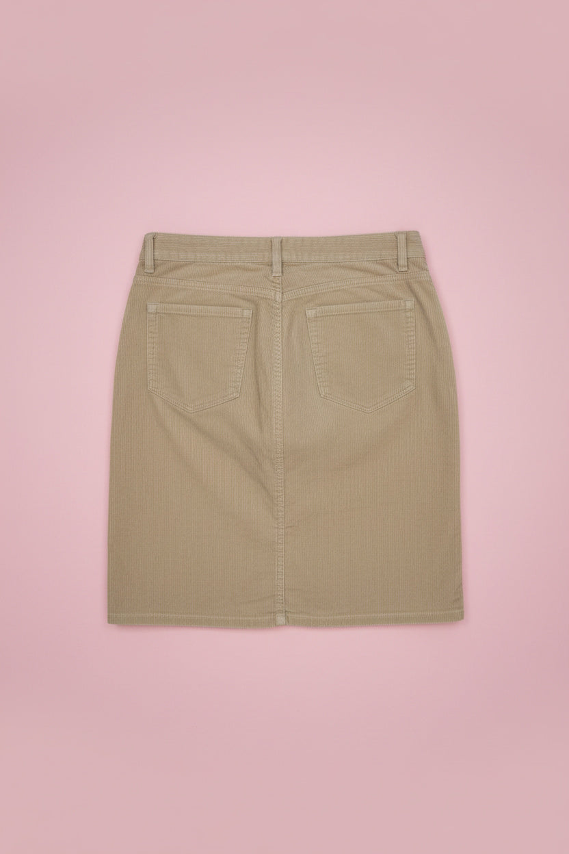 Jupe beige en texture type velours côtelé, juste au-dessus du genou, avec 5 passants de ceinture pour un style structuré.