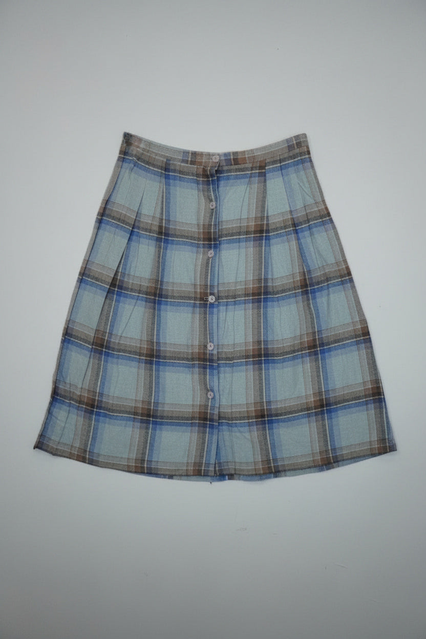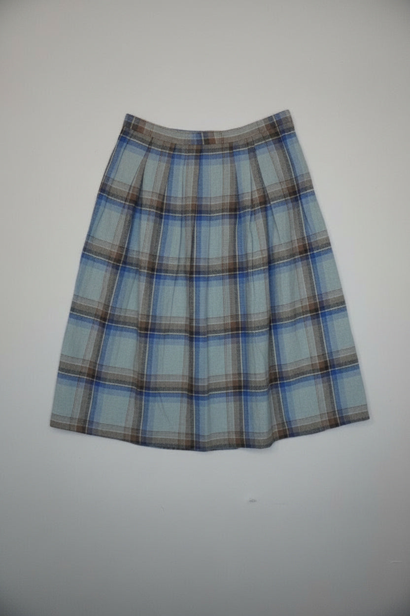 Jupe plissée bleu clair avec nuances de bleu et marron, coupe longueur mollet.