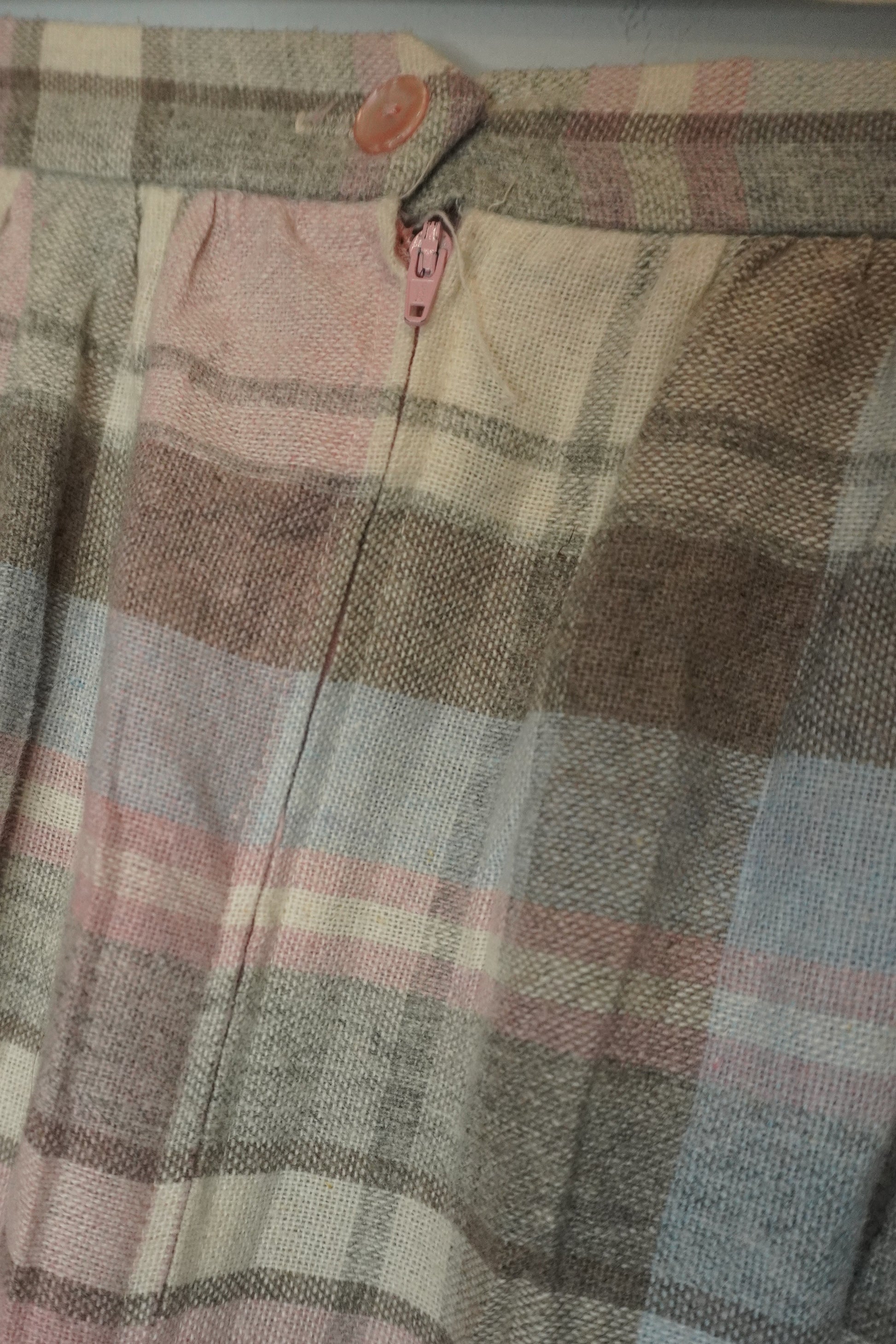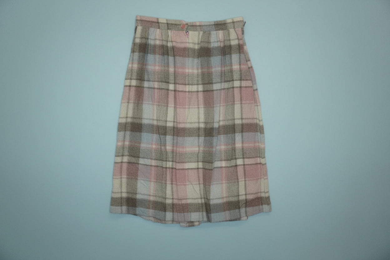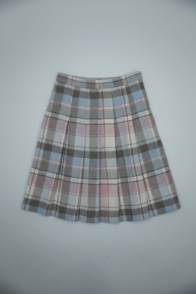 Jupe plissée rose clair avec nuances de bleu et marron, coupe longueur mollet.