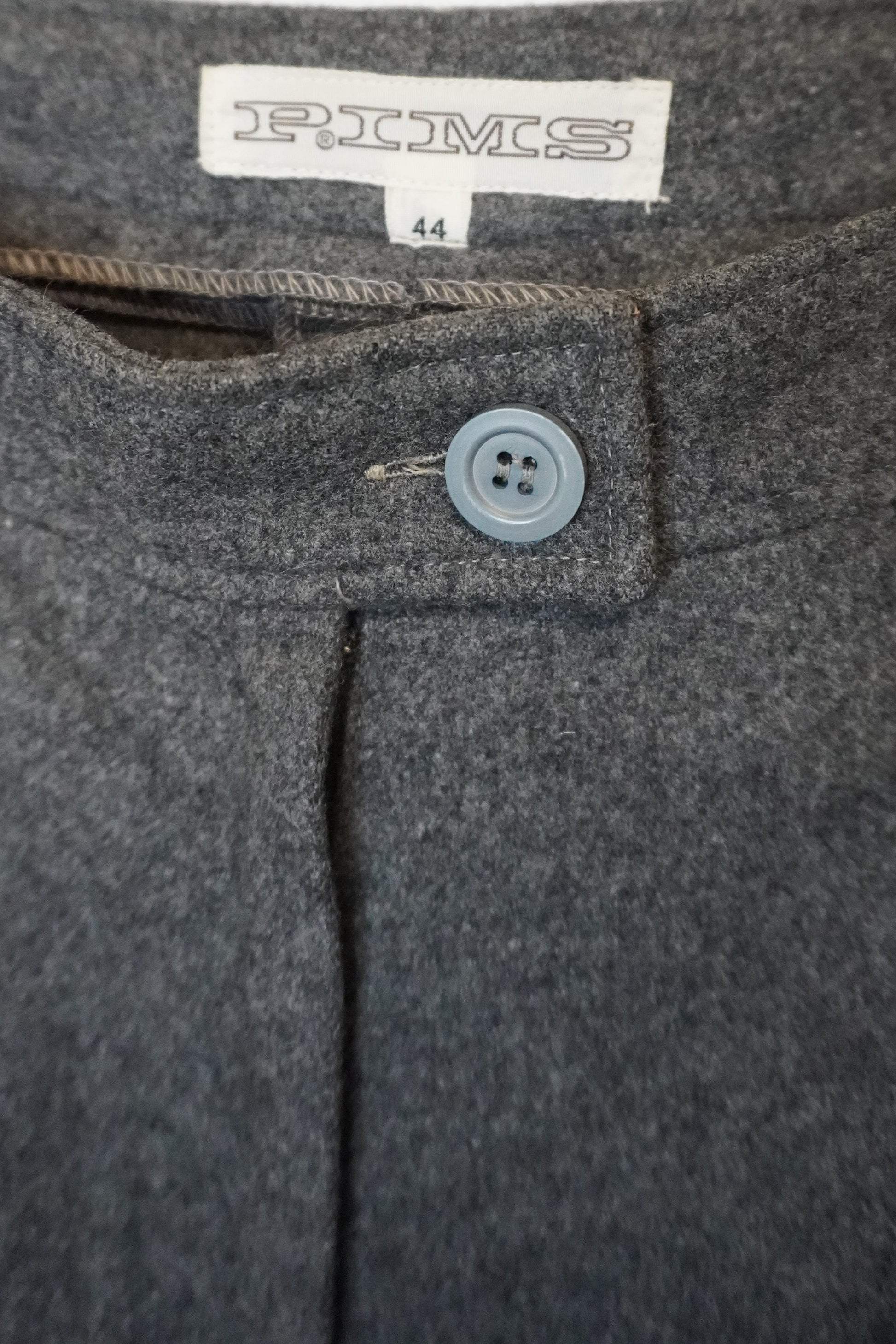 Pantalon droit gris en mélange laine-polyester, taille mi-haute, avec plis devant et coupe droite pour un look classique.