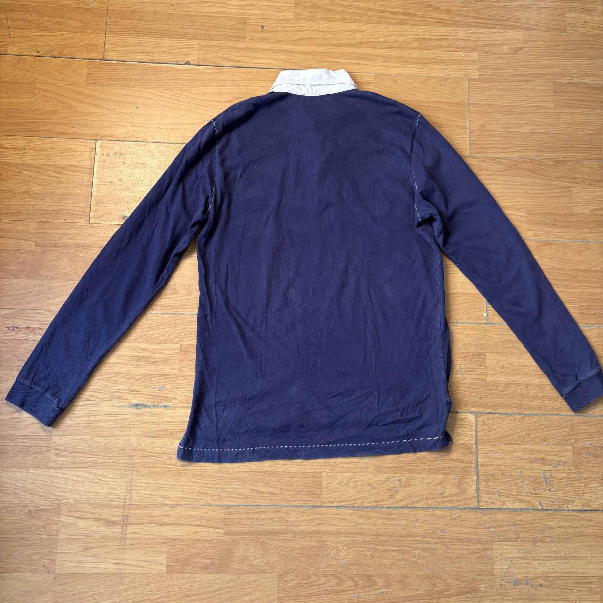 Polo à manches longues bleu marine avec col blanc au style classique et élégant, idéal pour une tenue décontractée ou habillée.