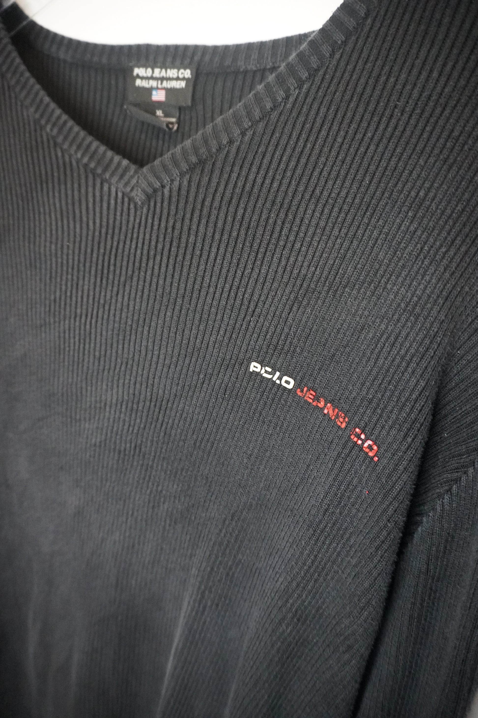 Pull noir en maille coton avec logo blanc et rouge, idéal pour un style casual chic.