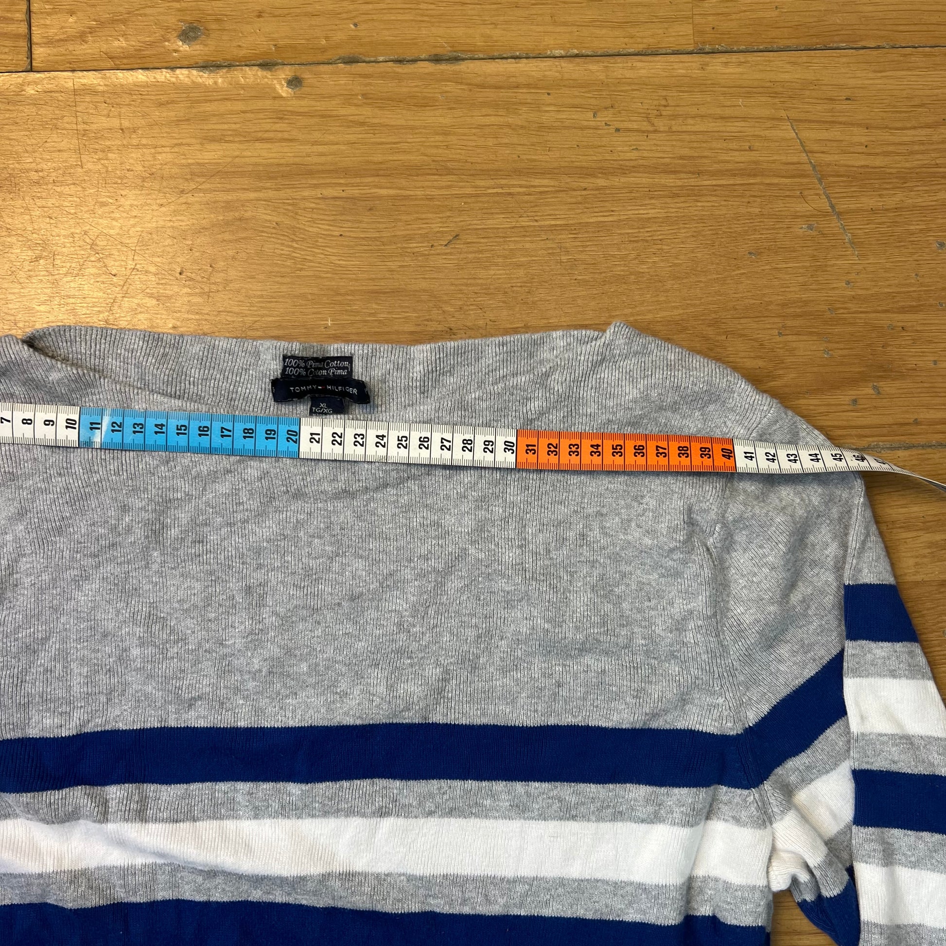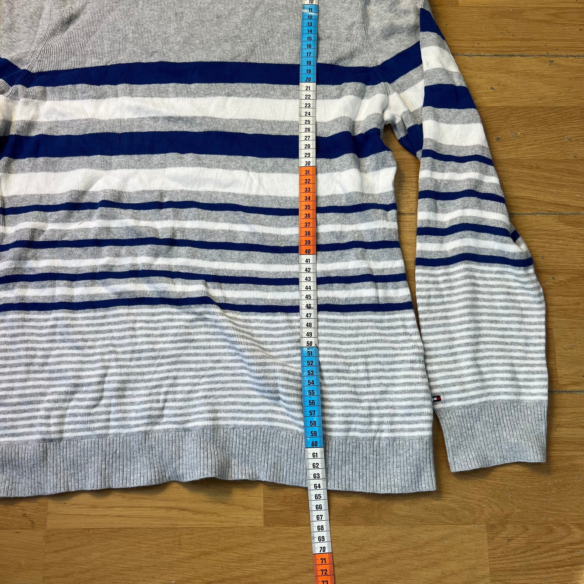 Ce pull rayé gris et bleu Tommy Hilfiger en 100% coton offre confort et style classique. Son col droit apporte une touche sobre et moderne, idéal pour un look casual ou légèrement habillé au quotidien. Les mesures sont indiquées sur les photos pour un ajustement précis.
