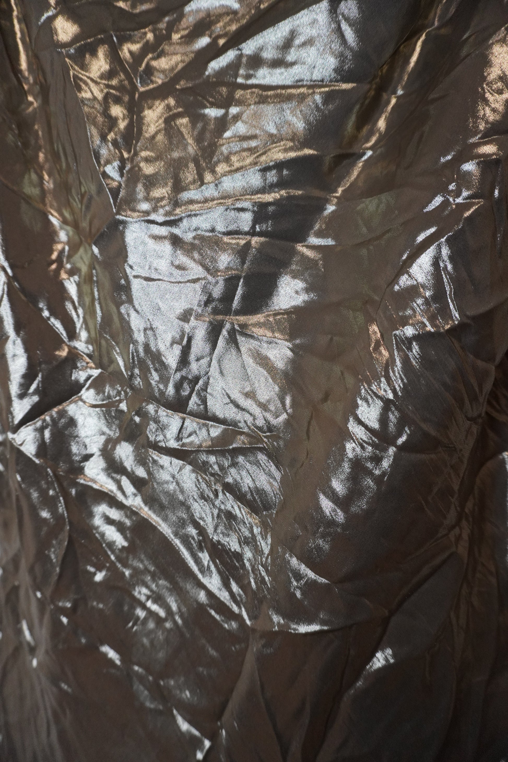 Robe dorée métallique, courte et sans manches, parfaite pour une soirée scintillante avec un col original.