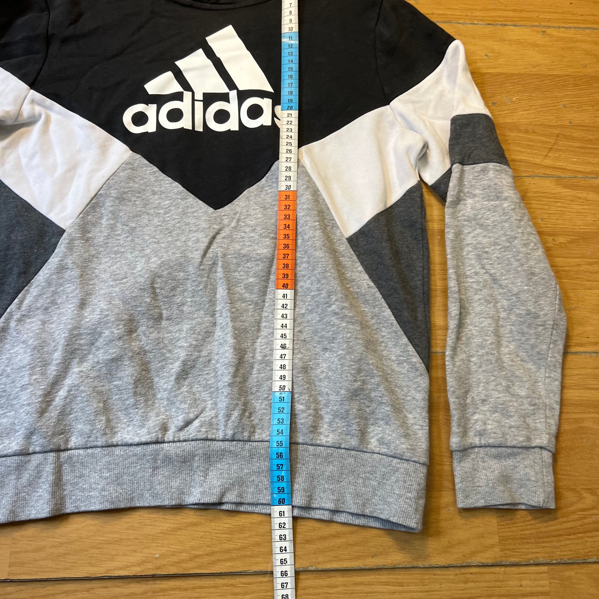 Ce sweat à capuche Adidas gris et noir offre confort et style sportif. Sa coupe classique le rend idéal pour le sport ou un look casual au quotidien. Les mesures sont indiquées sur les photos pour un ajustement précis.