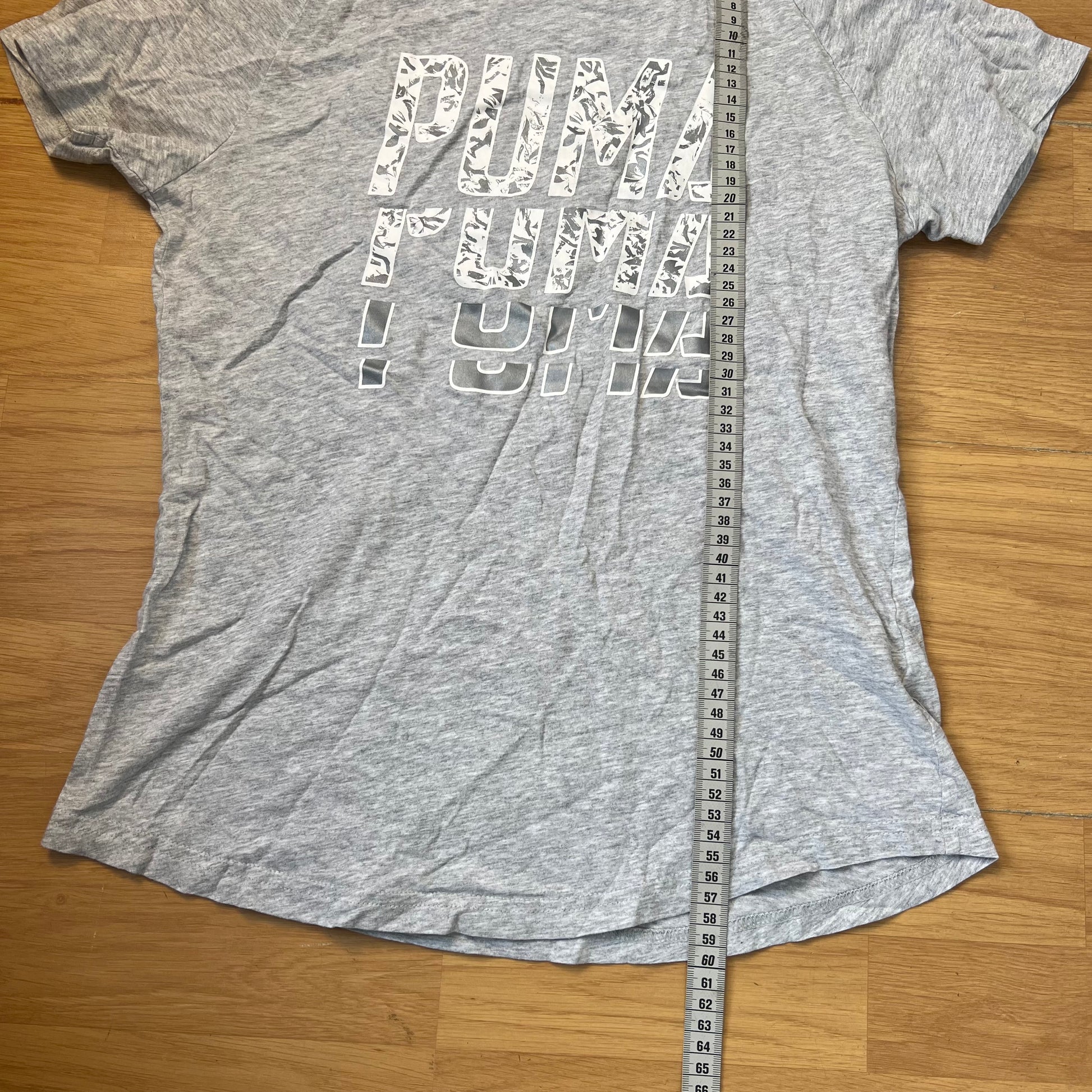 Ce T-shirt gris Puma pour femme offre confort et style décontracté. Sa coupe classique le rend facile à porter au quotidien, idéal pour un look casual ou sportif. Les mesures sont indiquées sur les photos pour un ajustement précis.