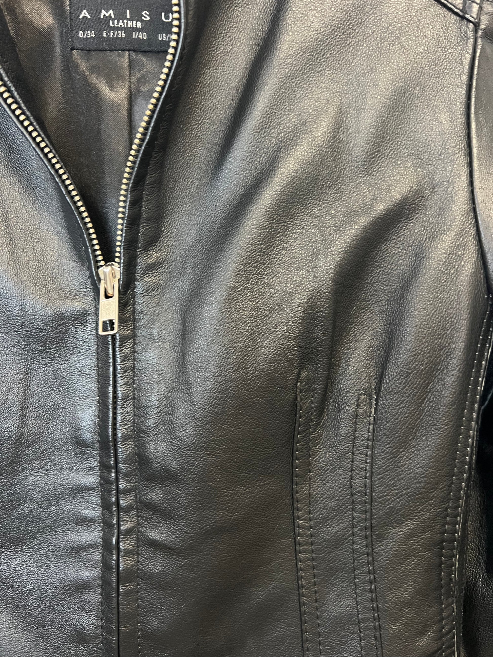 Cette veste Amisu en cuir véritable séduit par sa coupe cintrée qui met élégamment la silhouette en valeur. Son coloris noir intemporel et sa matière de qualité en font une pièce incontournable pour un look chic, urbain ou casual.