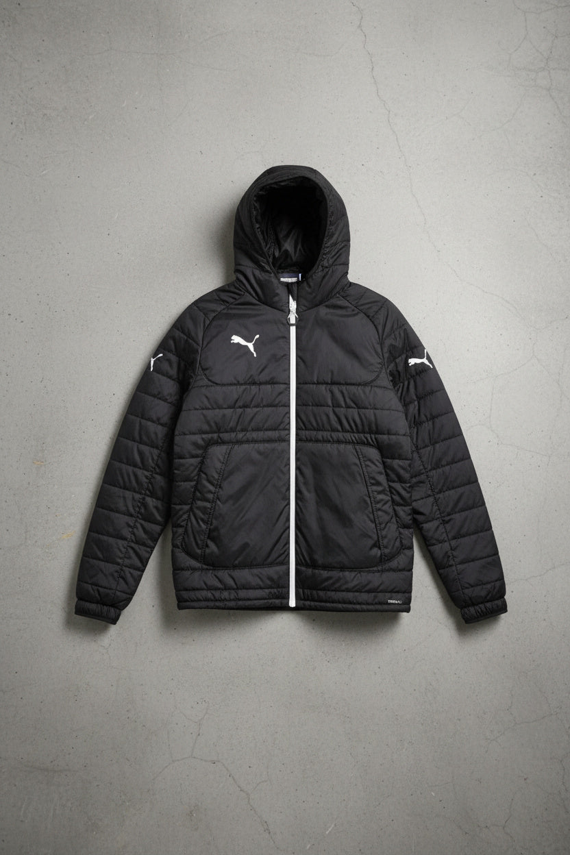Veste matelassée noire PUMA à l’extérieur imperméable, doublée en polaire noire pour une chaleur optimale, avec capuche intégrée pouvant se ranger dans le col.