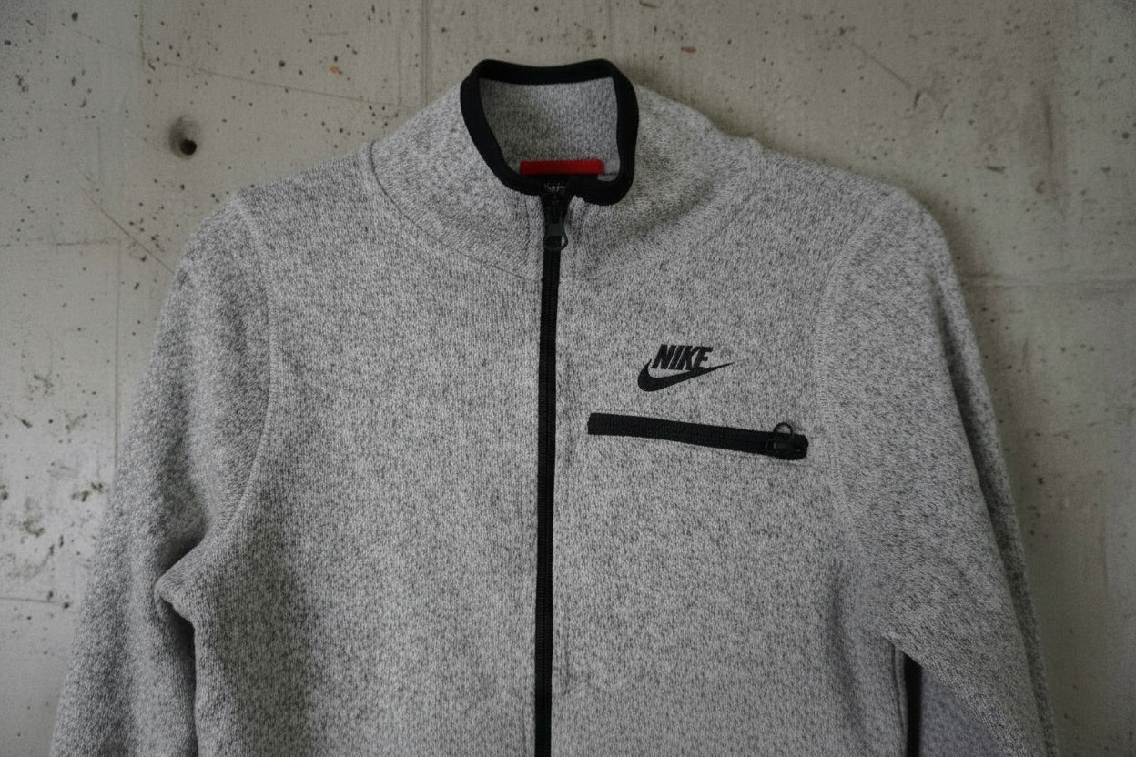 Veste polaire Nike en polyester gris, légère et fonctionnelle avec fermeture zippée.
